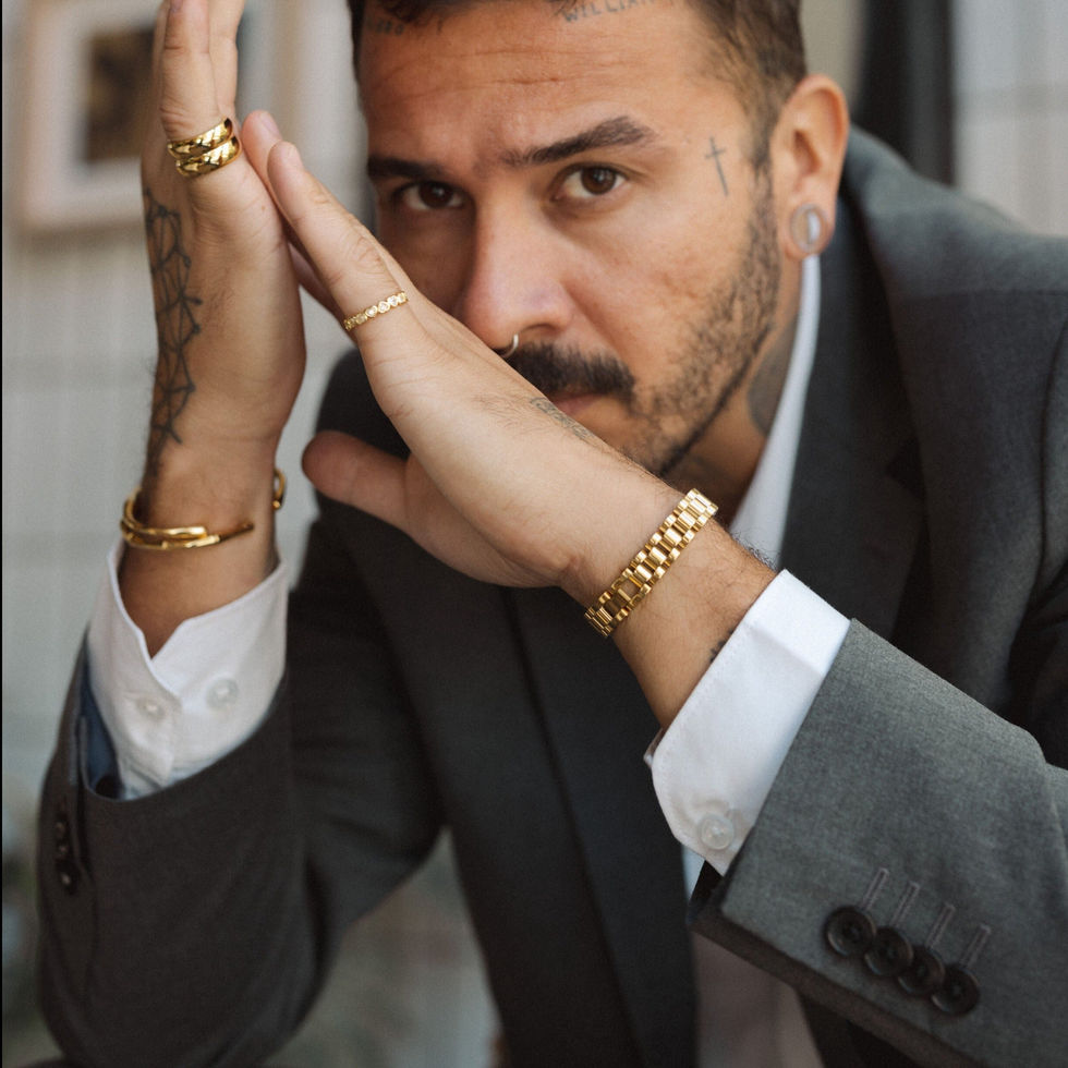 This stylish and versatile accessory seamlessly resembles a watch with the elegance of a bracelet. With its sturdy design and lustrous gold plating, this bracelet radiates luxury and refinement. This bracelet is a perfect accessory for those who appreciate a long-lasting piece of jewelry.